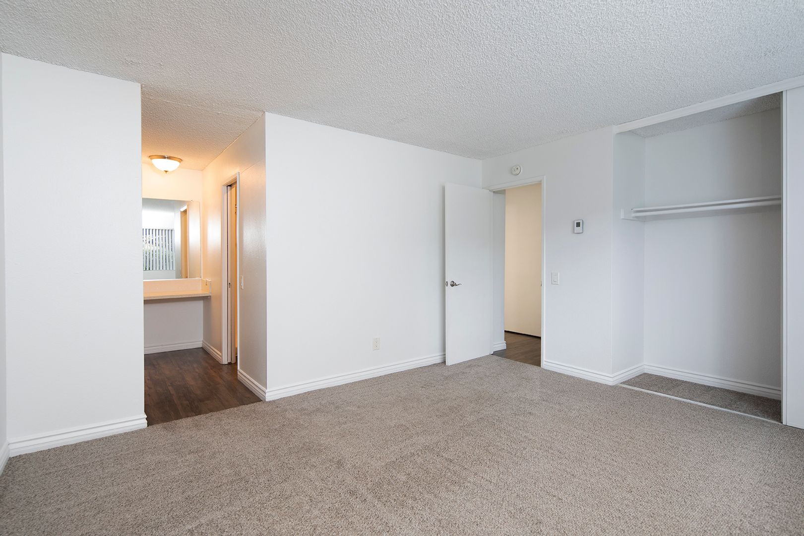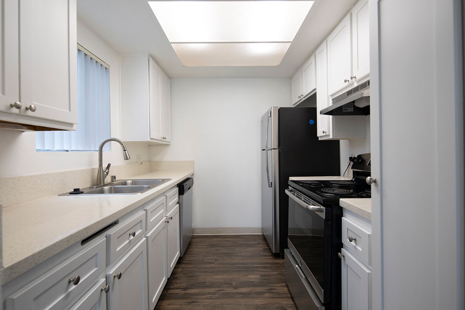 This spacious apartment features beautiful quartz countertops, white shaker cabinets, stainless steel appliances, a dishwasher, and vinyl plank flooring with cozy carpet in the bedrooms. This unit also includes a private balcony or patio.